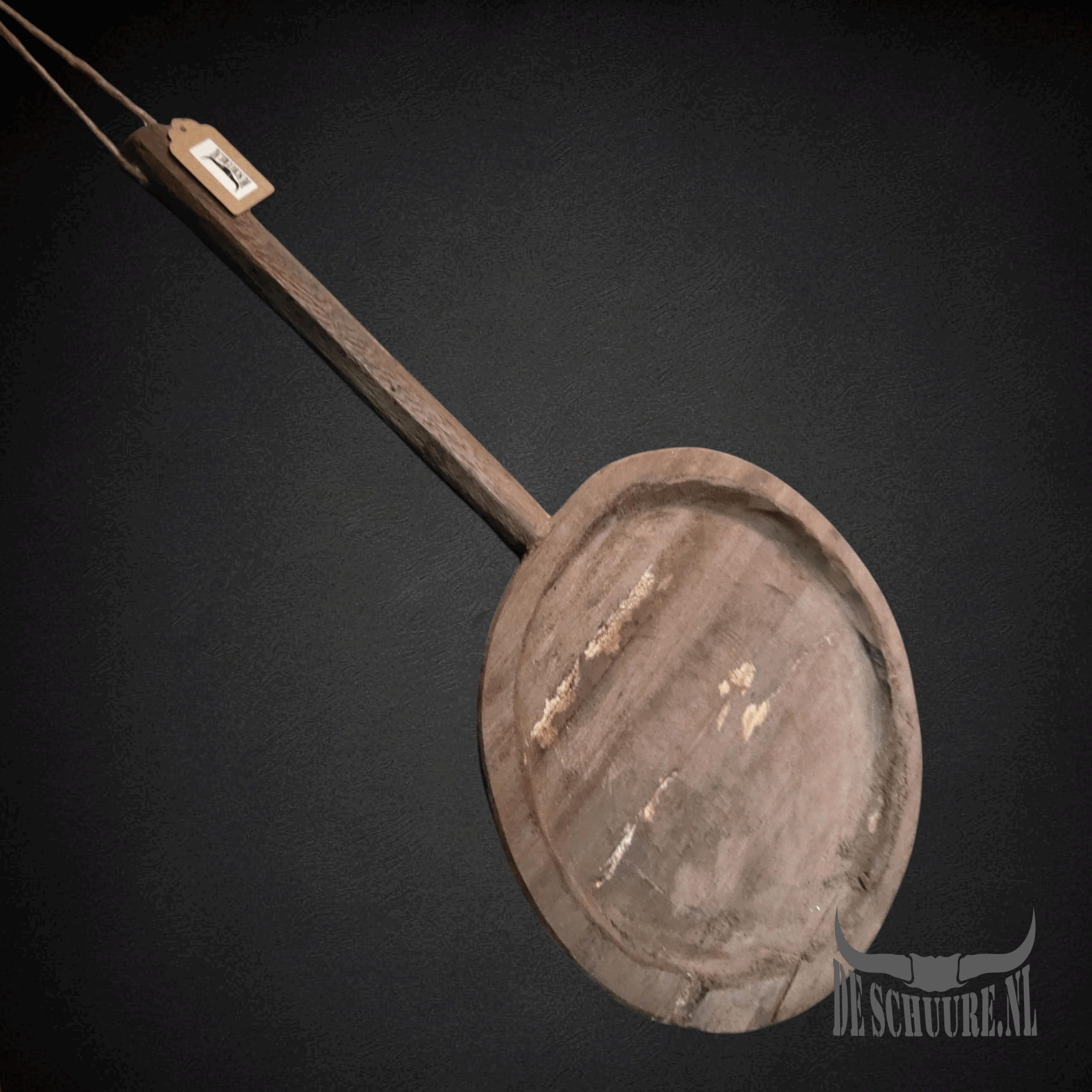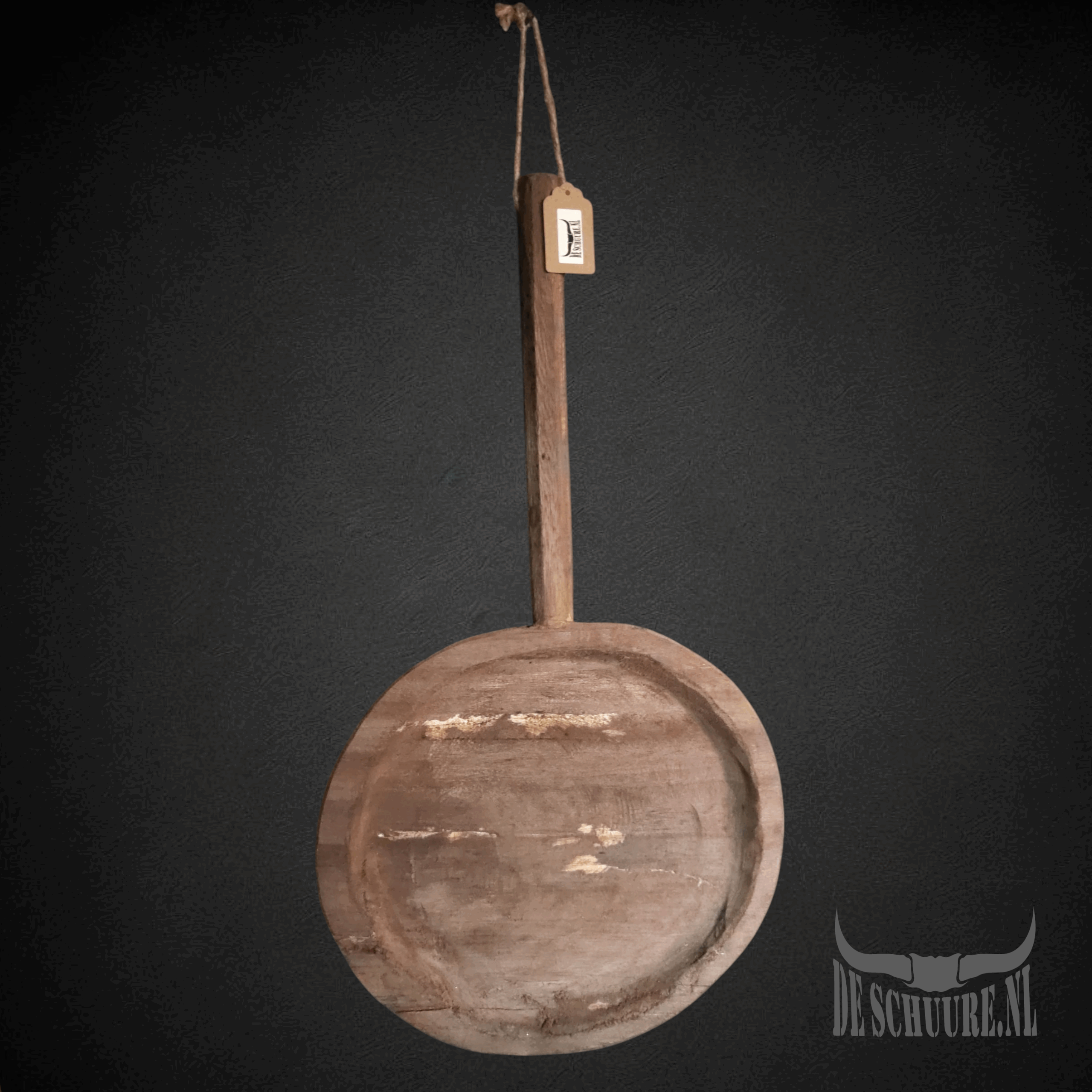 houten schaal met handvat. Ideaal als decoratie in een rustieke of landelijke stijl. De schaal is gebruikt en heeft een unieke uitstraling. Perfect voor het presenteren van kleine objecten of als een opvallend stuk in uw interieur.