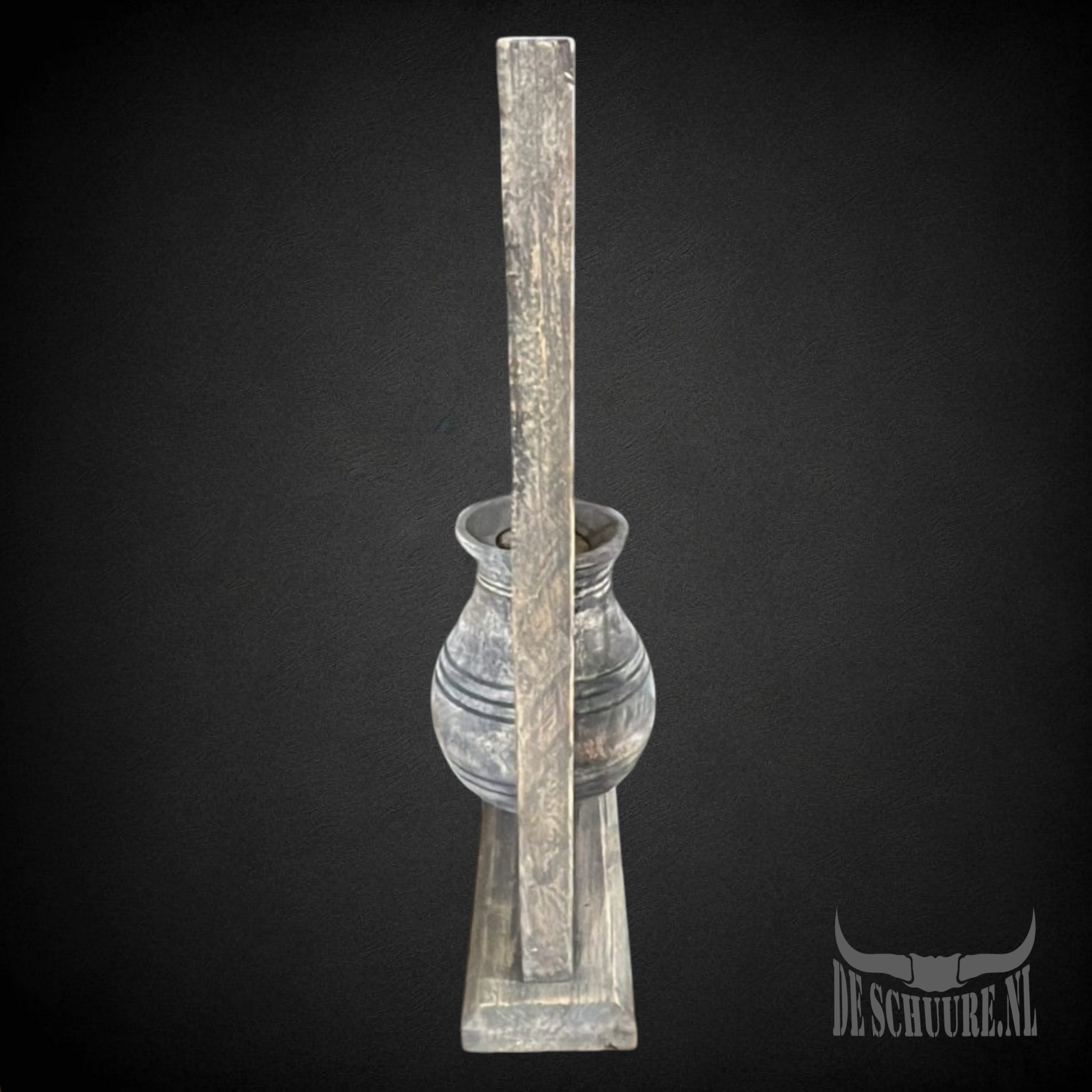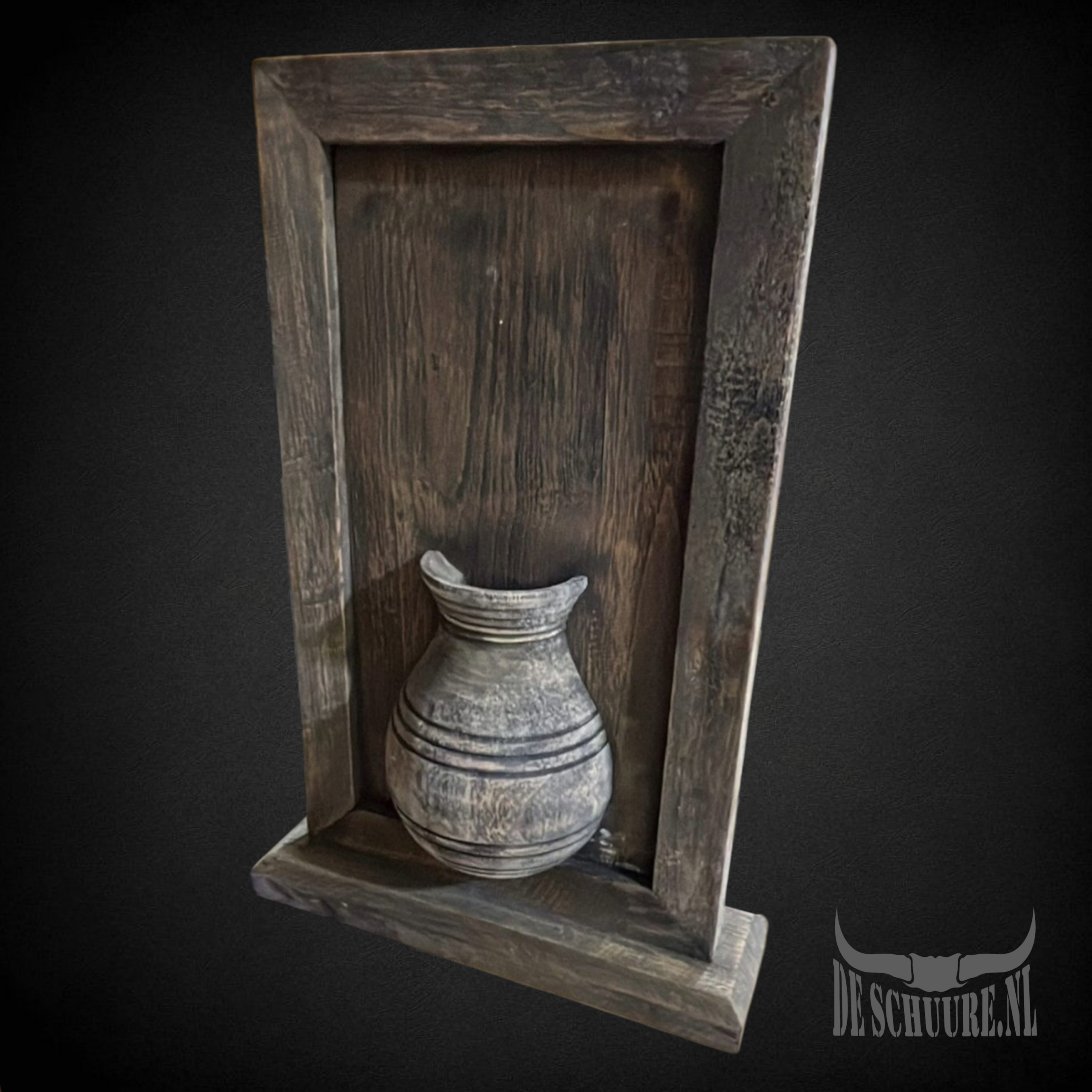 Houten lijst van massief teak in ‘vintage black’ met dubbele halve kruiken in staand model. Ideaal mode om te gebruiken in de vensterbank doordat hij mooi is aan beide zeiden.