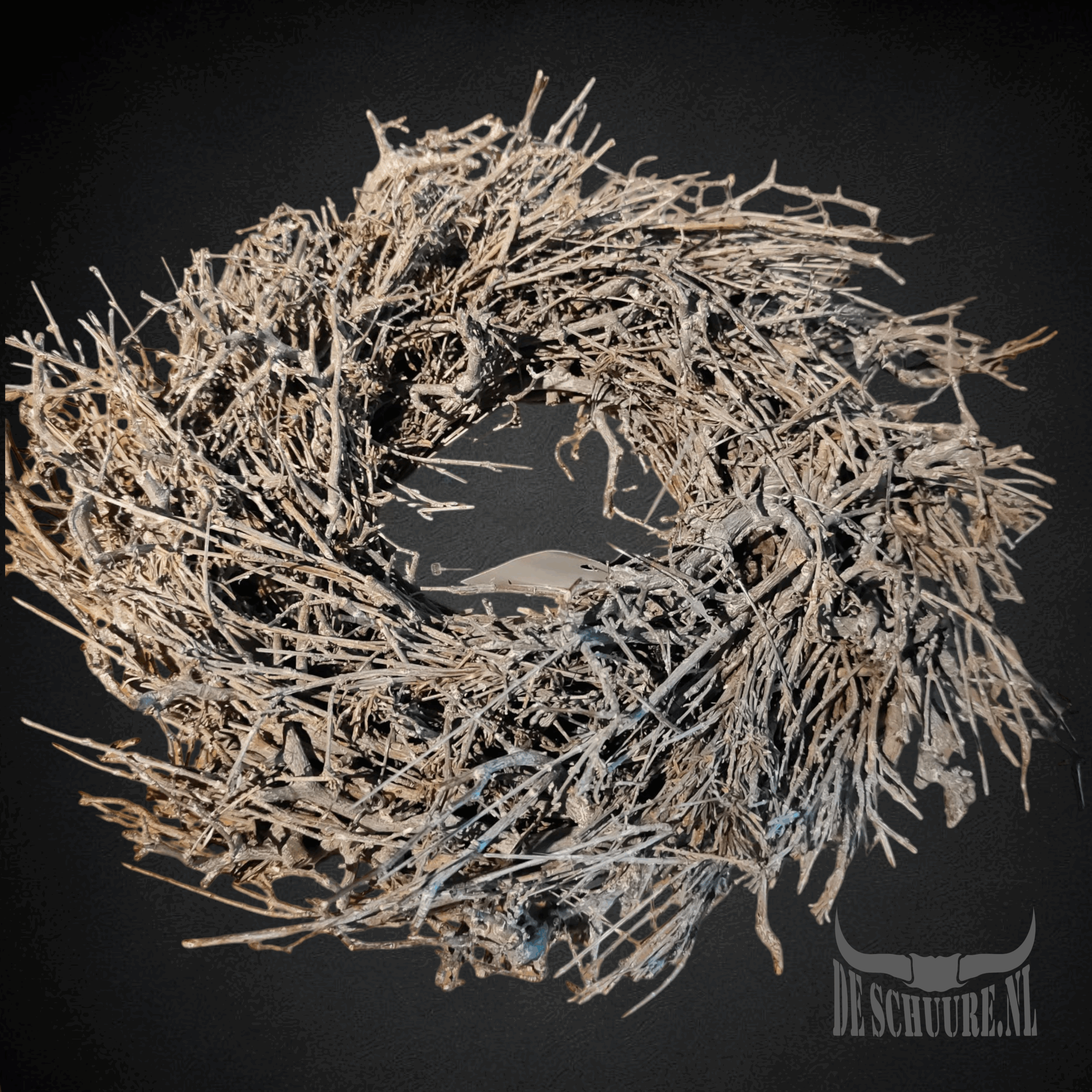 Een prachtige, volle krans gemaakt van natuurlijke takken. Perfect als decoratie voor aan de muur, deur of als tafelstuk. Geeft een rustieke en warme sfeer aan elk interieur. De krans is met zorg samengesteld en heeft een unieke uitstraling